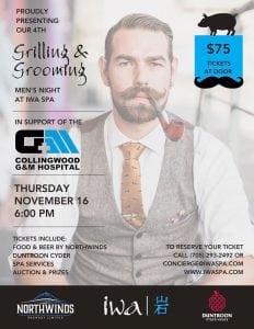 Grilling and Grooming – Men’s Night at IWA Spa by Neal Owen | Nov 1, 2017August 18th, 2021 | General NewsGrilling and Grooming – men’s night at IWA Spa. In support of the Collingwood G&M Hospital, Thursday, November 16 6:00PM. Tickets... Read More